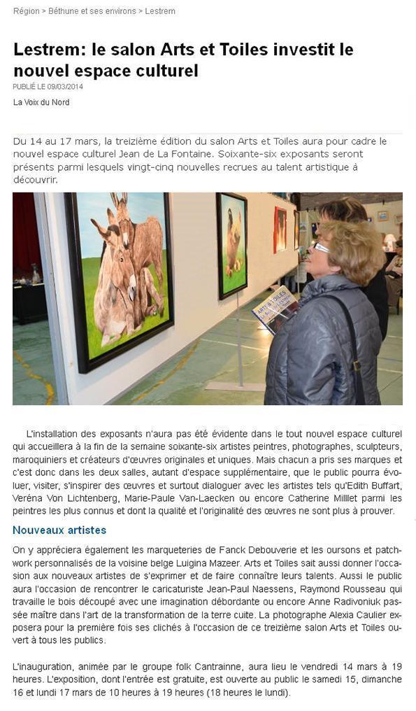 On y appréciera également les marqueteries de Fanck Debouverie et les oursons et patchwork personnalisés de la voisine belge Luigina Mazeer. Arts et Toiles sait aussi donner l’occasion aux nouveaux artistes de s’exprimer et de faire connaître leurs talents. Aussi le public aura l’occasion de rencontrer le caricaturiste Jean-Paul Naessens, Raymond Rousseau qui travaille le bois découpé avec une imagination débordante ou encore Anne Radivoniuk passée maître dans l’art de la transformation de la terre cuite. La photographe Alexia Caulier exposera pour la première fois ses clichés à l’occasion de ce treizième salon Arts et Toiles ouvert à tous les publics.
